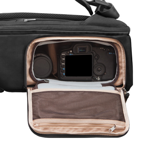 Without the camera insert inside the Moshi backpack, it is very spacious for carrying conference materials, lights and batteries. It has special dome top flap which is good for safekeeping eyeglasses, microphones or other items that can be easily smashed. The inside of the dome has a zipper pouch which is good for extra batteries and memory cards.